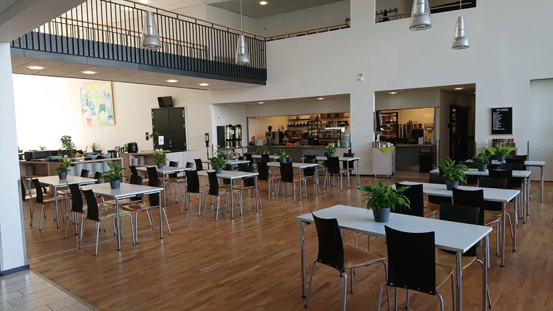 Caféen på KUC er lys, venlig og rummelig. Her er plads til 160 personer, men kan udvides til 230 personer afhængig af arrangementstype.